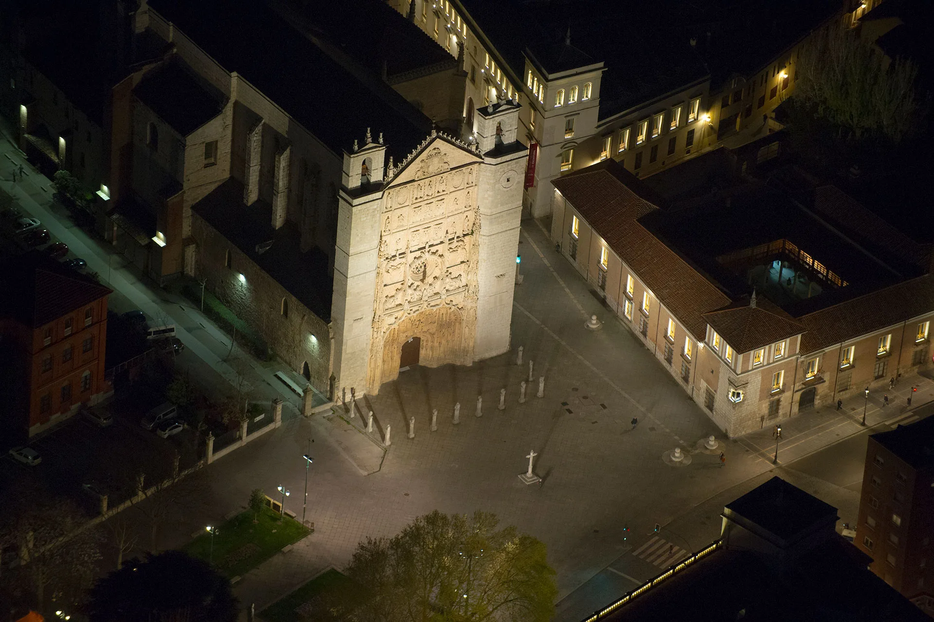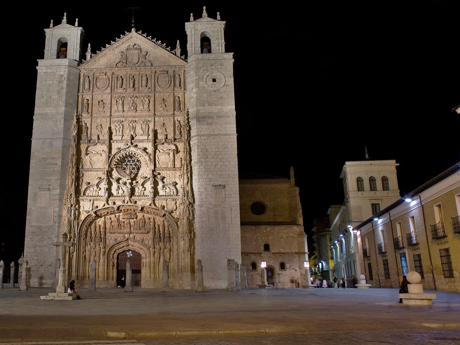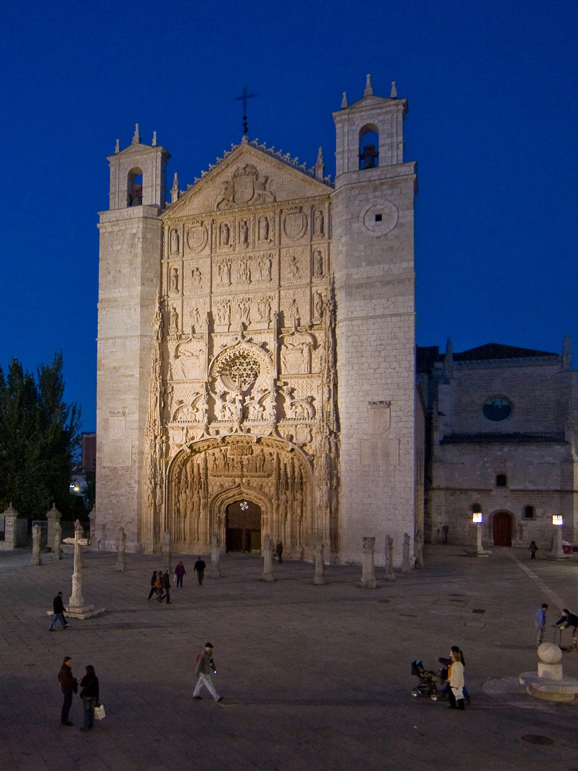 La magnífica fachada, con un entresijo ornamental digno de admiración, es un auténtico retablo en piedra. Originalmente solo contaba con el cuerpo inferior (hasta el rosetón) y el frontón superior, que se separó y se elevó hasta su ubicación actual en el siglo XVII a instancia del Duque de Lerma, quien se procuró varios homenajes incluyendo su escudo en el cuerpo nuevo.