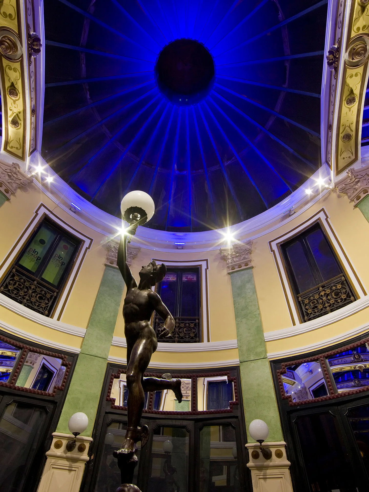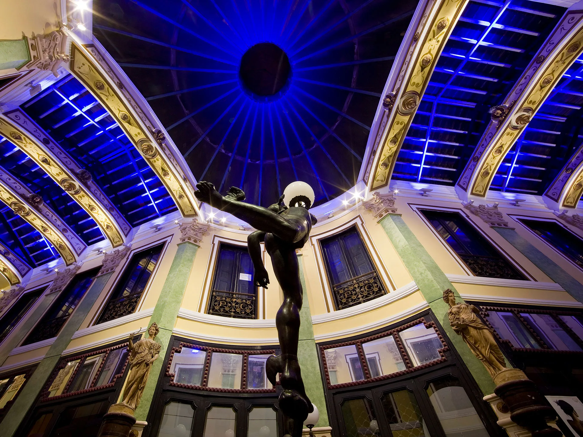 La galería consta de dos tramos articulados en torno a una rotonda central con una cúpula acristalada, que deja pasar la luz natural. Bajo ella descansan las estatuas del dios del comercio, Mercurio, y de las Cuatro Estaciones.