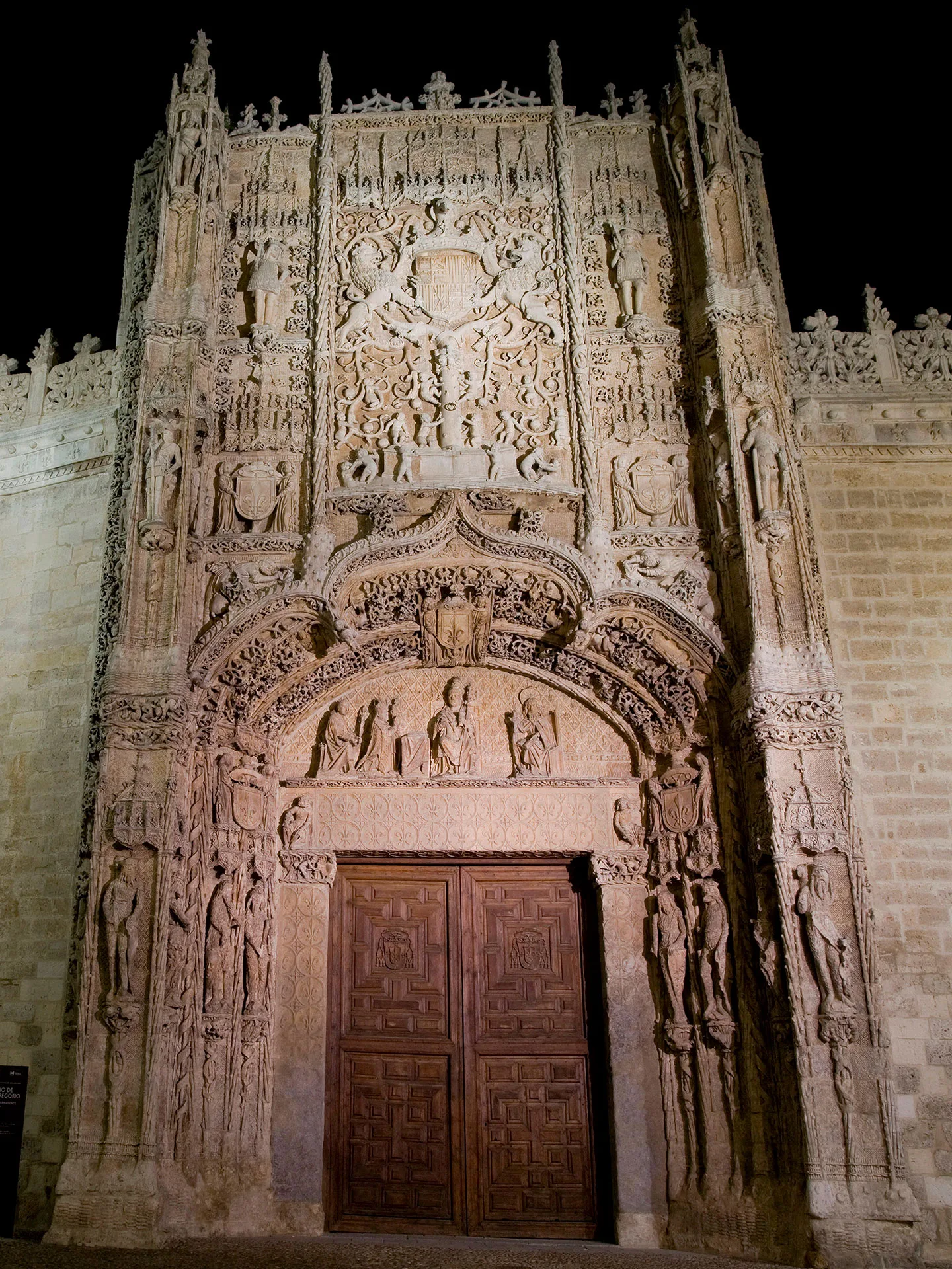 La condensada ornamentación de su fachada hispano flamenca, atribuida a Gil de Siloé, ha sido objeto de numerosas controversias interpretativas. Justo sobre la puerta se ve al fundador, fray Alonso de Burgos, haciendo una ofrenda a San Gregorio ante San Pablo y Santo Domingo. La flor de lis, emblema de este fraile, que quiso dejar su huella en el edificio; se repite hasta la saciedad en toda la fachada, pero también en el patio, en la escalera y en los artesonados originales que conservan las salas del museo.